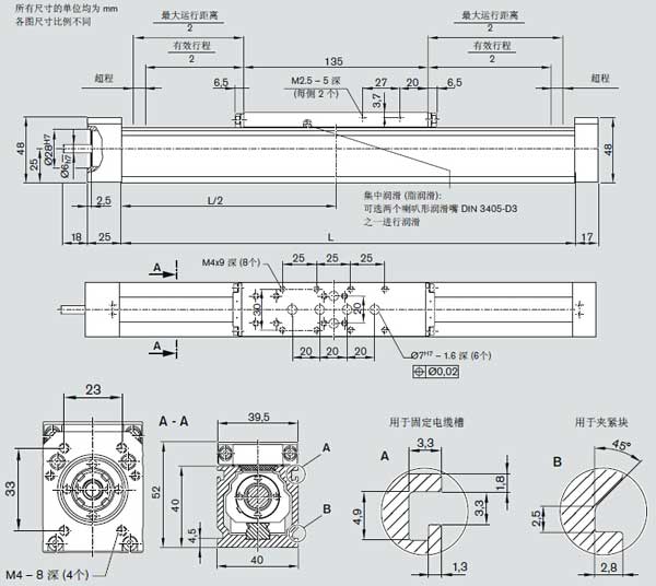 ––一个滑台,带 T 型槽或螺纹孔 (在 MKK 15-65和 MKK 20-80 中) 用于安装上装件,滑台能够集中润滑