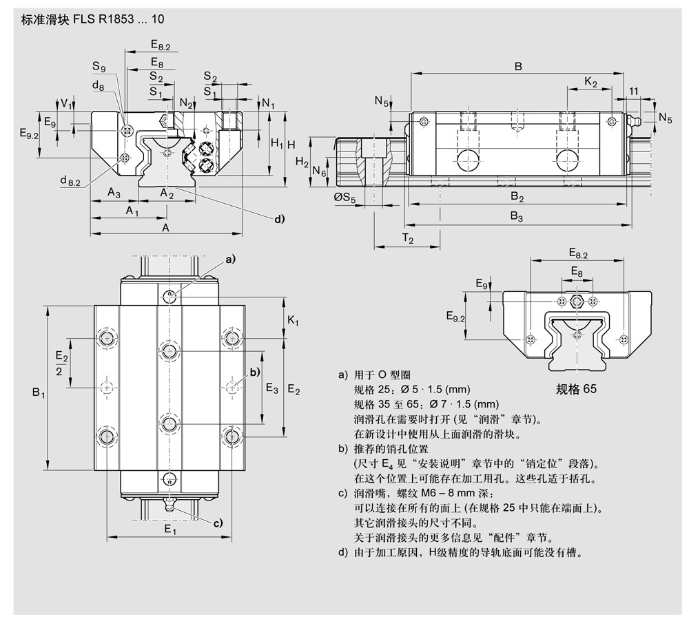 滑块 FLS R1853 ... 10 法兰型, 长, 标准高 更多款式滑块 --带铝端盖 --从上面进行油润滑和脂润滑 --用于集中油润滑 --用于墙面安装